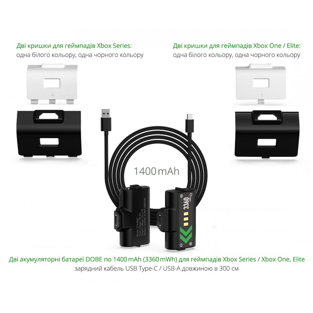 - Акумуляторні батареї DOBE сумісні з геймпадами Microsoft Wireless Controller останніх поколіннь консолей Microsoft Xbox Series S | Xbox Series X, Xbox One / X / S / Elite;