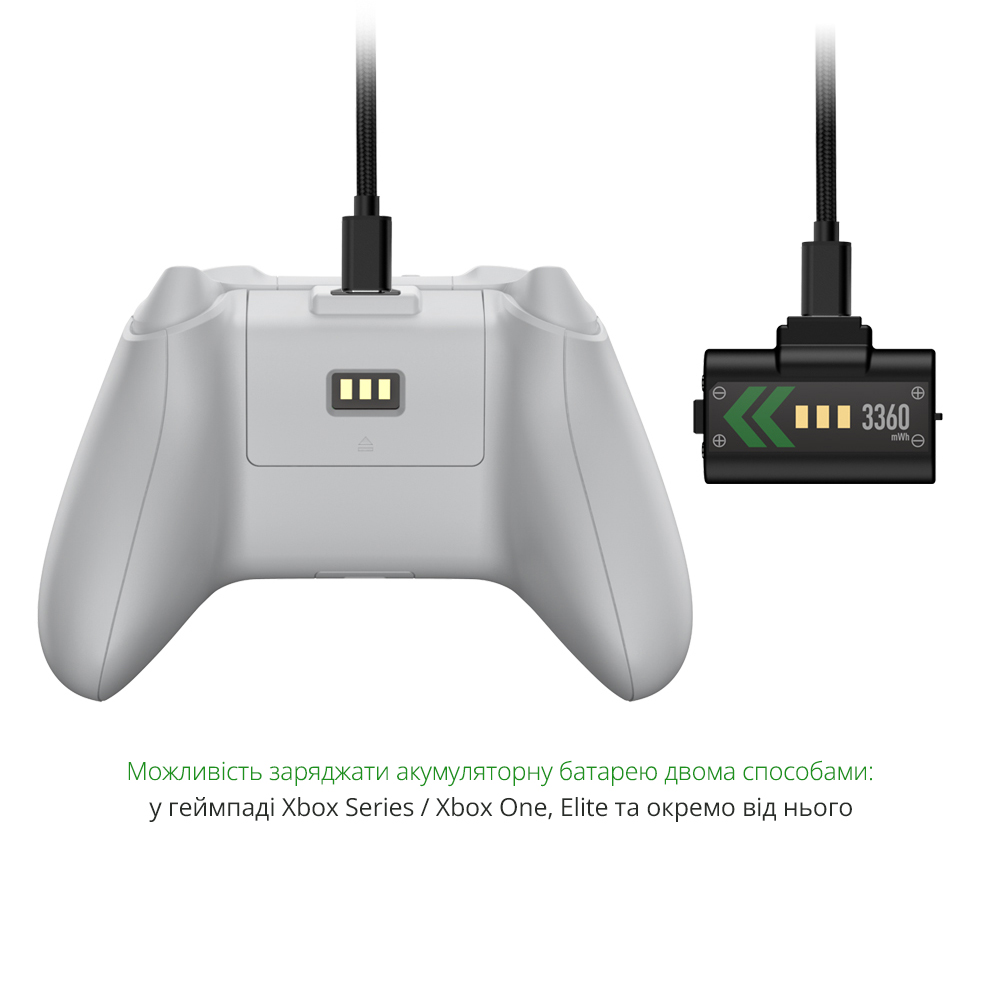 - Акумуляторна батарея під'єднується і заряджається від будь-якого USB-A роз'єму, який є в консолі, ПК або зарядки для смартфону/планшета.