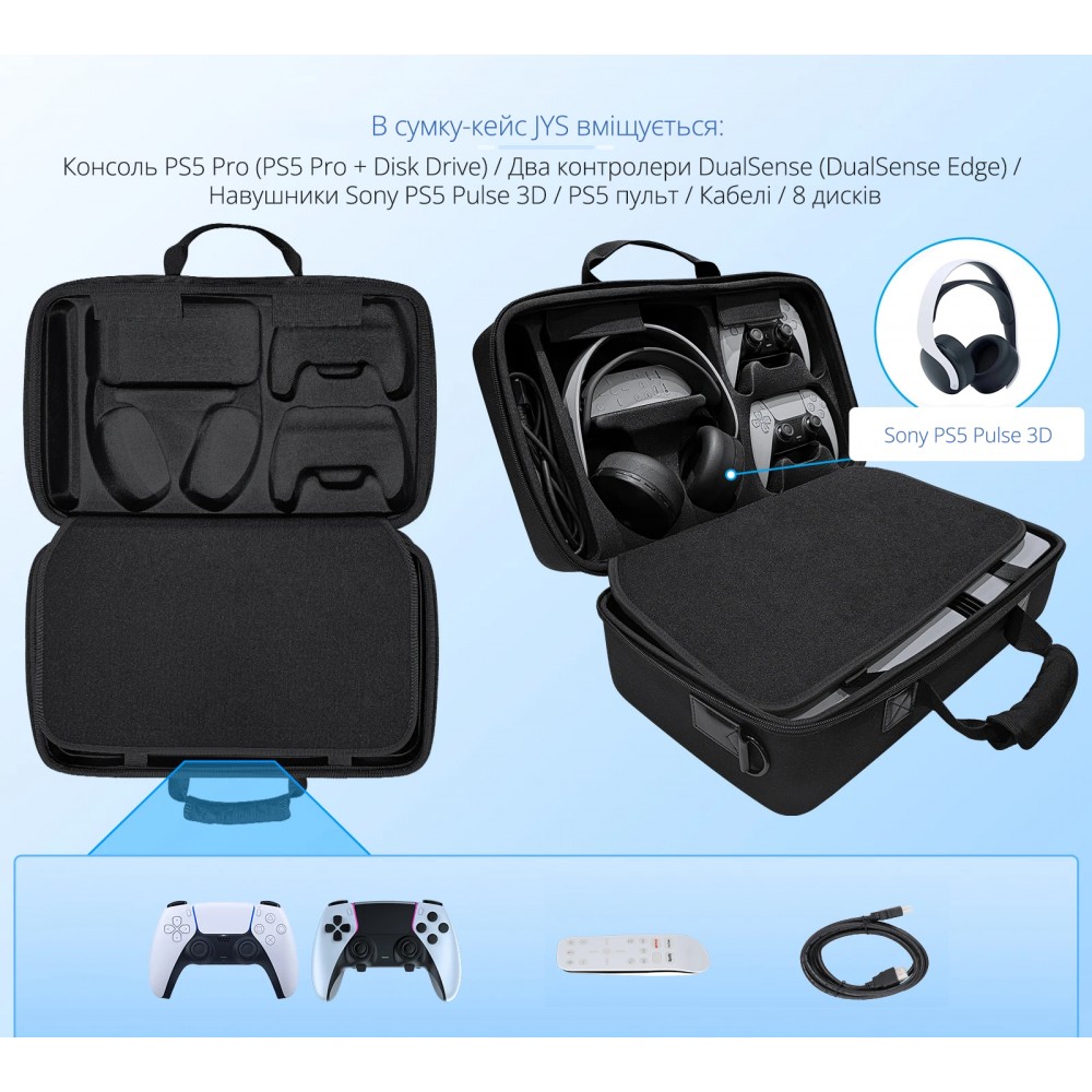 - У сумку JYS поміщається ігрова консоль PS5 Pro або PS5 Pro + Disk Drive, два контролери DualSense / DualSense Edge, навушники Sony PS5 Pulse 3D, пульт-кабелі, диски, дрібні аксесуари;