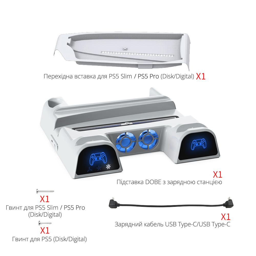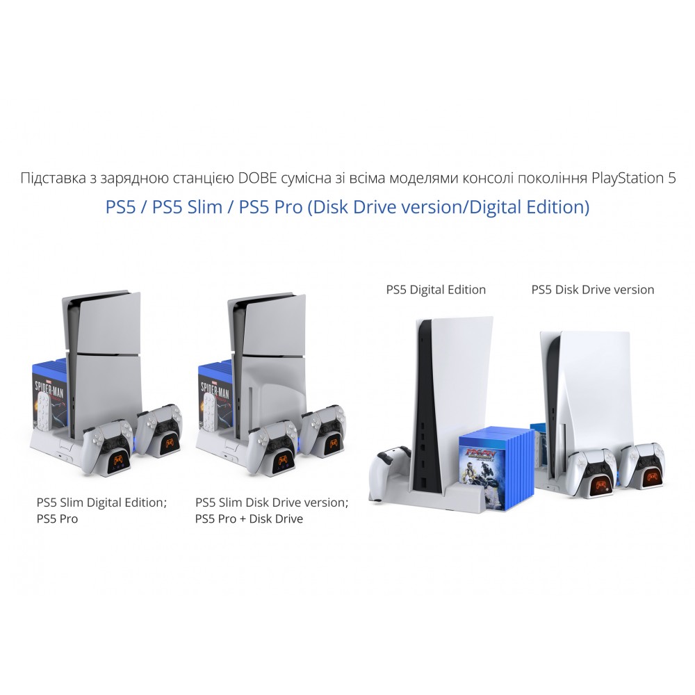 - Підставка DOBE сумісна з усіма моделями консолі PlayStation 5: PS5 Disk Drive version / PS5 Digital Edition / PS5 Slim Disk Drive version / PS5 Slim Digital Edition / PS5 Pro / PS5 Pro + Disk Drive;
