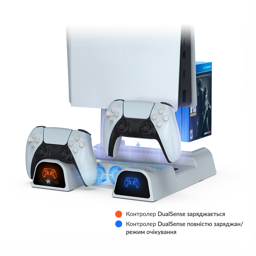 Підставка із зарядною станцією має все необхідне для зручного та комфортного користування консолями PS5 серії.