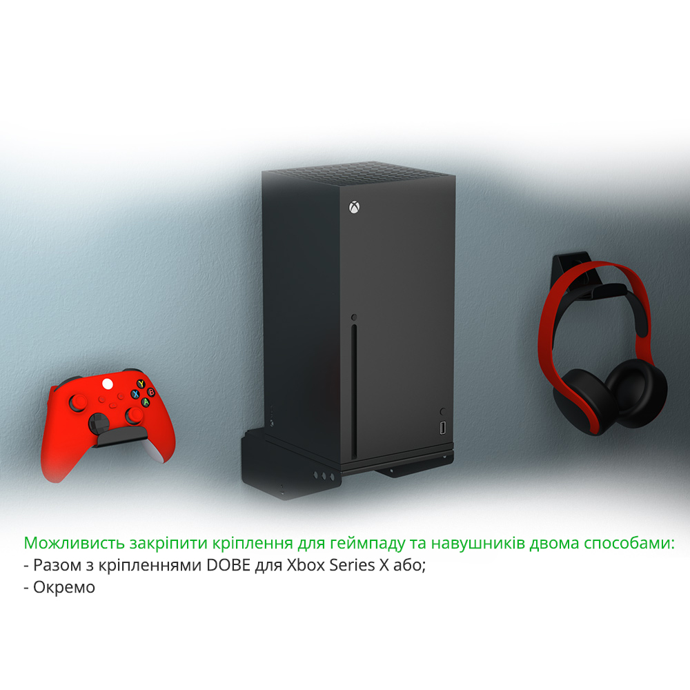 Тепер консоль останнього покоління Xbox Series X, геймпад Microsoft Wireless Controller і навушники Xbox Wireless Headset зафіксовані в зручному для вас місці завдяки кріпленню DOBE!