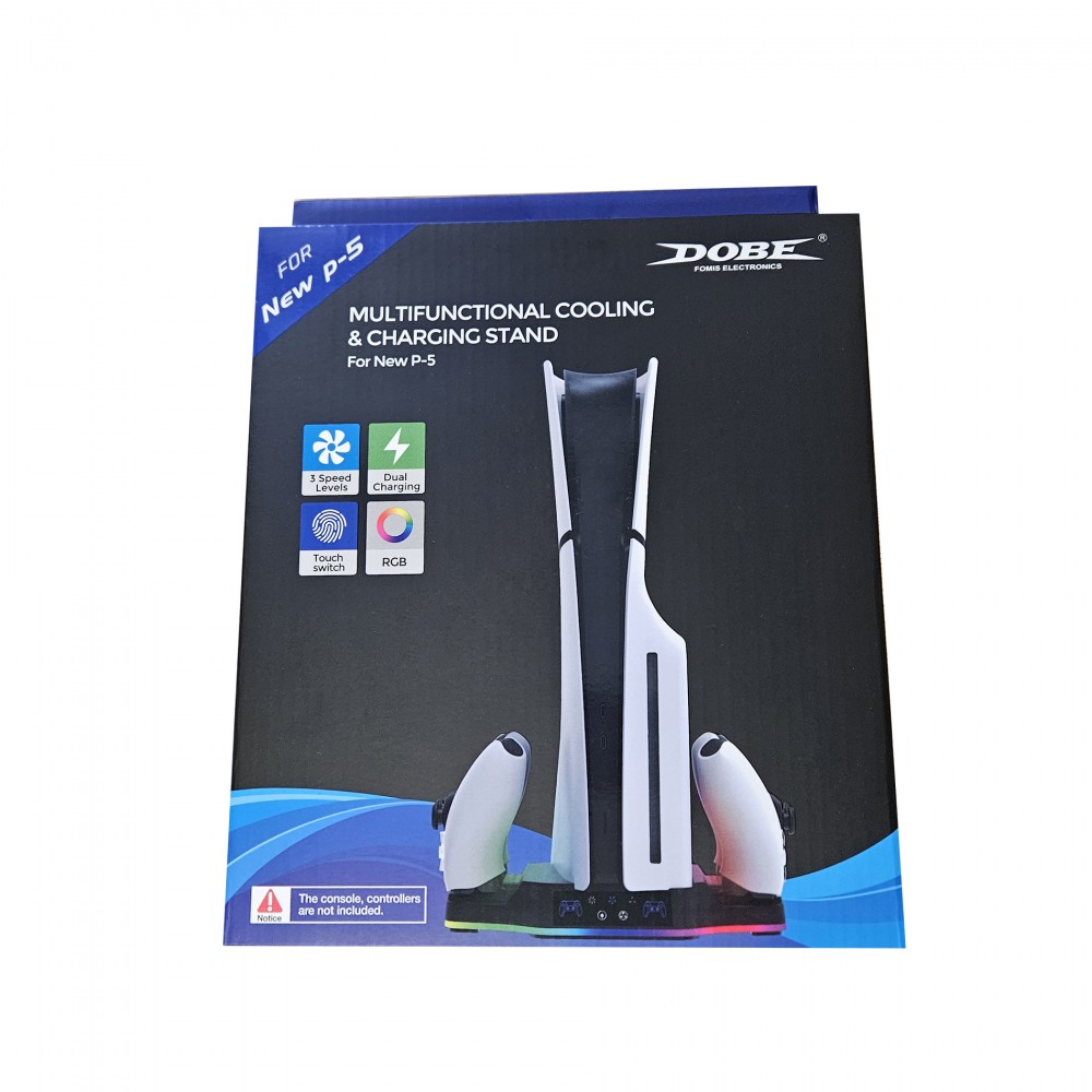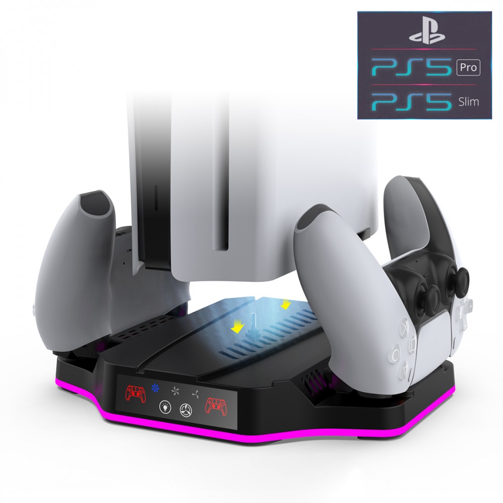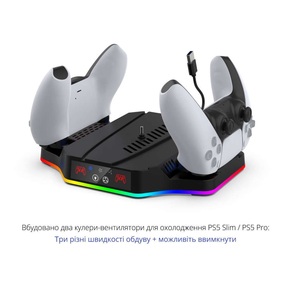 - Охолоджувальна підставка DOBE для консолі PS5 Slim / PS5 Pro (Disk Drive version/Digital Edition) із зарядною станцією для двох DualSense;