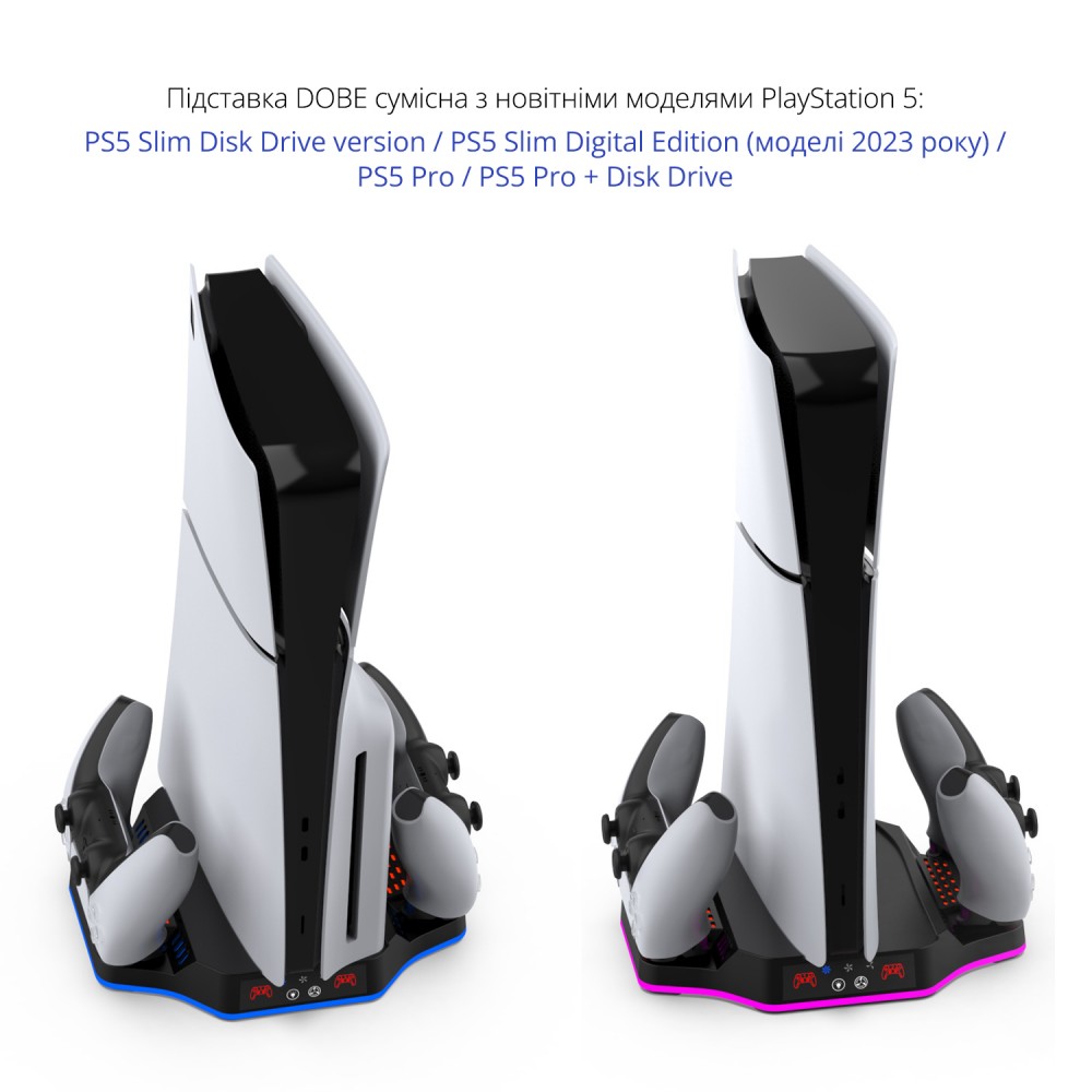 - Підставка DOBE сумісна з новітніми моделями консолі PlayStation 5: PS5 Slim Disk Drive version / PS5 Slim Digital Edition (моделі від 2023 року) / PS5 Pro / PS5 Pro + Disk Drive;