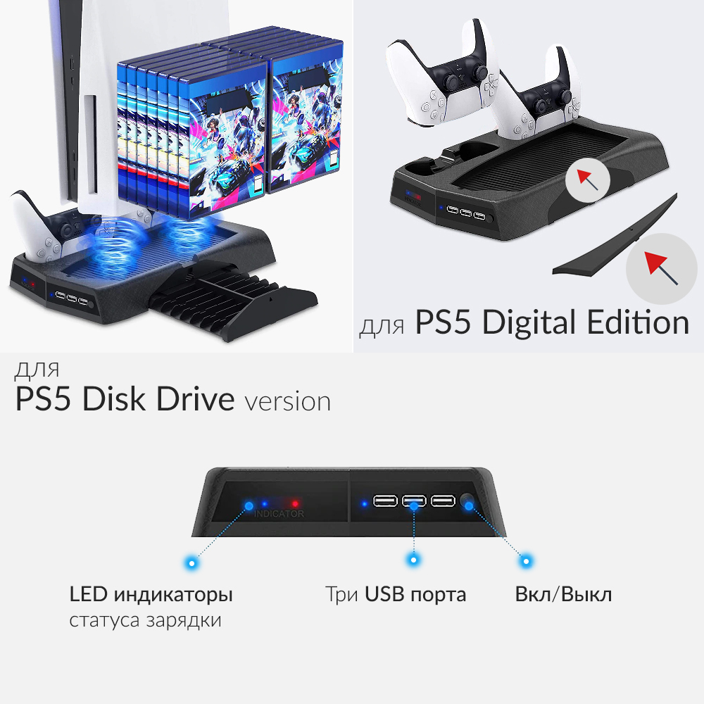 Вертикальная подставка KJH для Sony PlayStation PS5 Disk Drive version / PS5 Digital Edition с охлаждающими кулерами, зарядная станция для двух геймпадов DualSense с LED подсветкой, подставка под 14 дисков