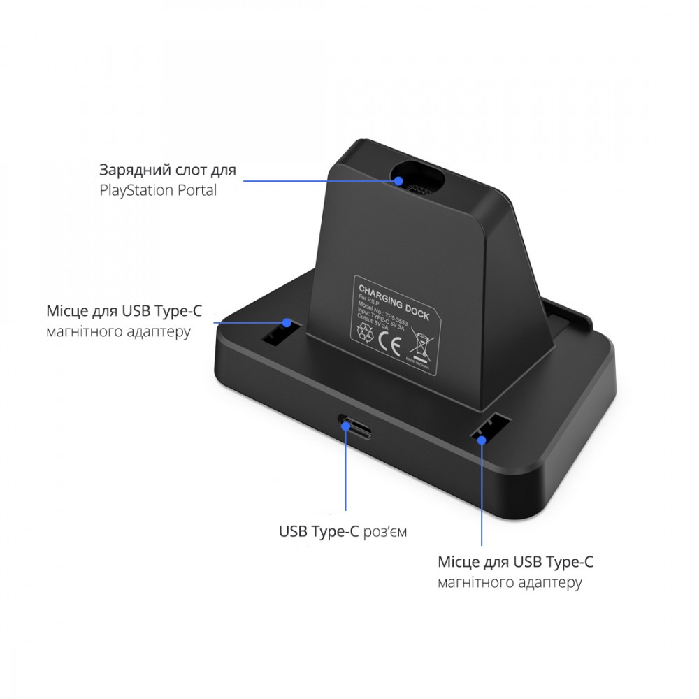 - Контактна зарядка в док станції через магнітний USB Type-C адаптер для зручного та поліпшеного заряджання PlayStation Portal (два адаптери в комплекті);