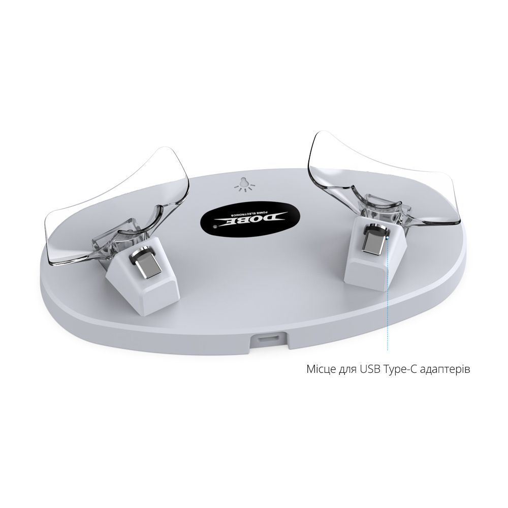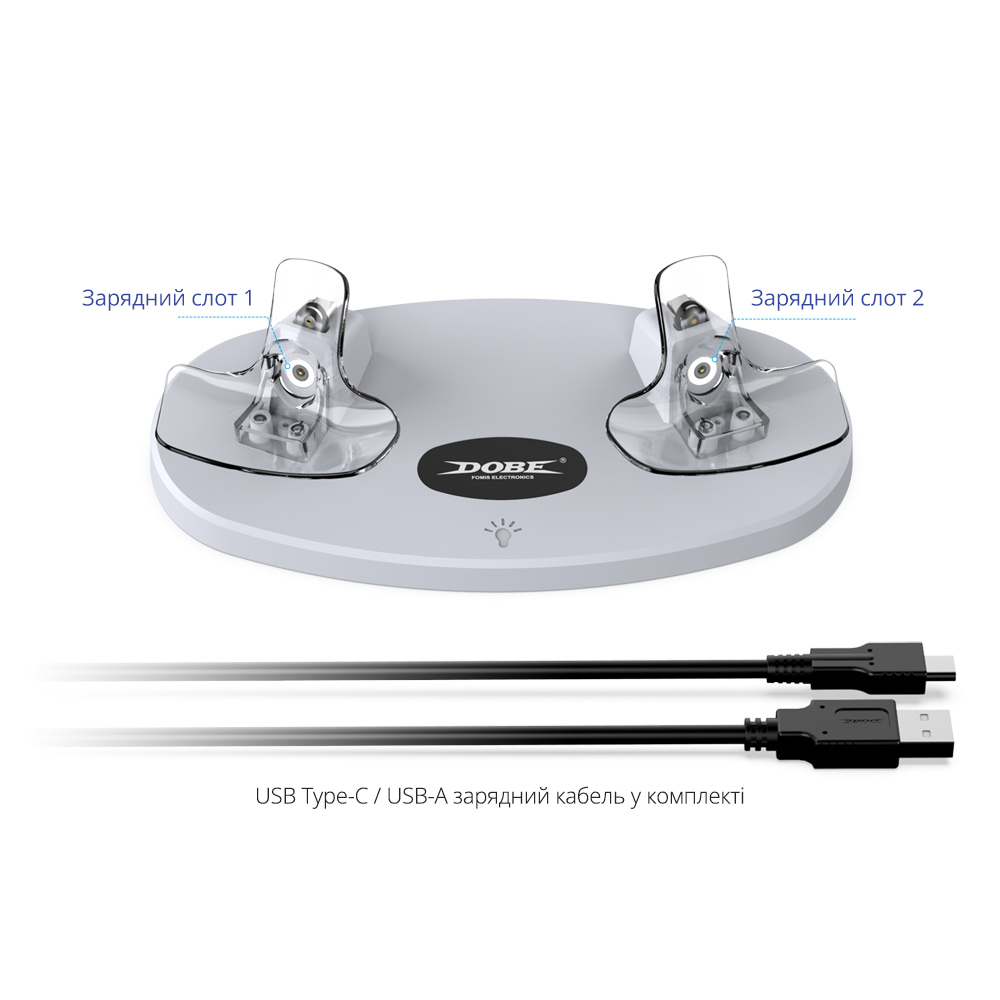 - Зарядна станція DOBE під'єднується до будь-якого USB-A роз'єму, який є в консолі PS5/PS5 Slim, ноутбука, ПК (кабель USB Type-C / USB-A в комплекті);